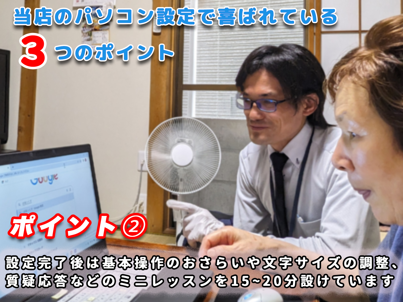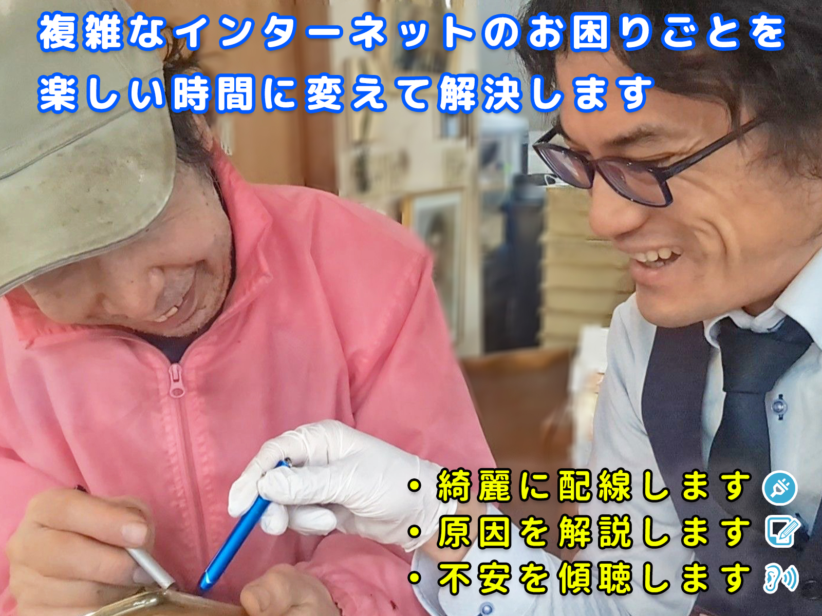 ■パソコン・スマホ等の初期設定・・・ Windowsパソコン、Macコンピューター iPhone/Android/タブレット端末に対応! ・料金内で設定後は一緒に動作確認と、 基本操作レッスンも行っております! ■訪問レッスン、トラブル診断・・・ 【スマートフォンの訪問レッスン】を 承っており大変好評を頂いております! その他、ネット関連のお困りごとで、 ・インターネットが繋がらなくなった ・Wi-Fiルーターの設定をしてほしい ・Zoomを使えるようにしてほしい といったご依頼も喜んでサポートさせて 頂きますのでお気軽にご相談下さい! ■ネットワークカメラの設置・・・ ※電気工事を伴わないカメラ設置です※ ご家庭のインターネット回線を利用した ・お子様 ・ペットちゃん ・介護見守り などの主に見守り用途のカメラで、 防犯にも利用出来ます。録画機能のほか、 動きを感知してスマートフォンなどに通知を したり、カメラのある部屋に向かって 「声かけ」も可能です。 初期費用・維持費がお安く済みます! ■AV機器配線・・・ テレビ、録画機の設定のほか、 それらのWi-Fi機能の設定も行い、 楽しく使えるようにサポートを致します!